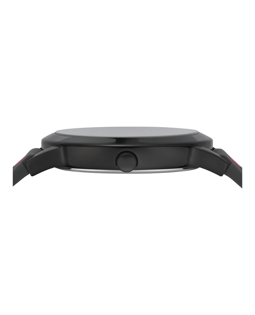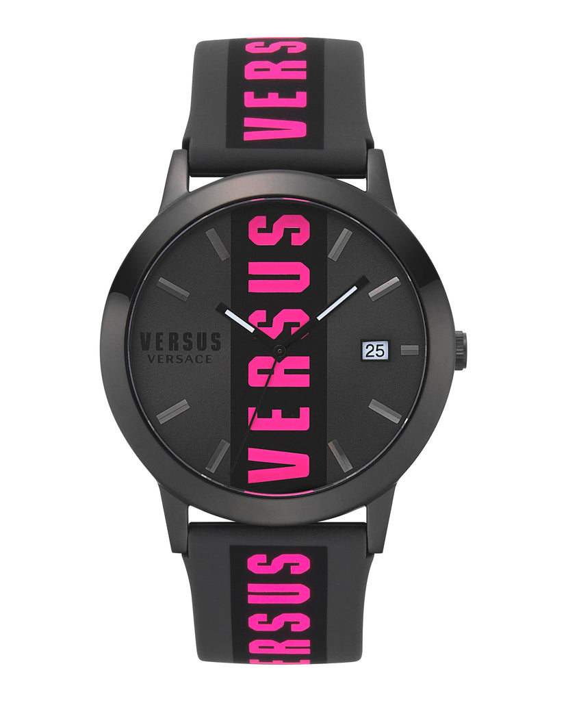 Strong contrast for Versus Barbés. A cool and modern watch full of brand DNA. Versus texture on the mesh band and fluo contrast on silicone strap to provide a summer look & feel. 44mm slim case body and black IP plating for a glamour touch.